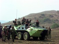 Photo – 1) Russian soldiers in an armored personnel carrier (in Kosovo not Chechnya, but you get the idea) 2) A Chechen man prays during the battle for Grozny, by Mikhail Evstafiev
