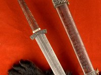 Photo – Sword Tyrnung by Jake Powning, including a scabbard that contains two stanzas of the Runatal in Old Norse, making it something of a combo of pen and sword